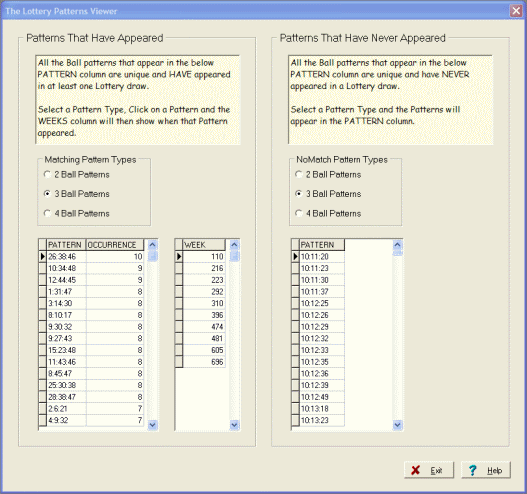 - The final option on the Main Form "View Pattern Data" gives you the ability to View every single Pattern that has ever appeared in a Lottery draw, the weeks on which that Pattern appeared and in addition all the Patterns that have never appeared. You can view all the 2, 3 and 4 Ball Patterns. This will help you to identify the most popular 2,3 and 4 Ball Patterns and increase your chances of picking a winner for yourself.
