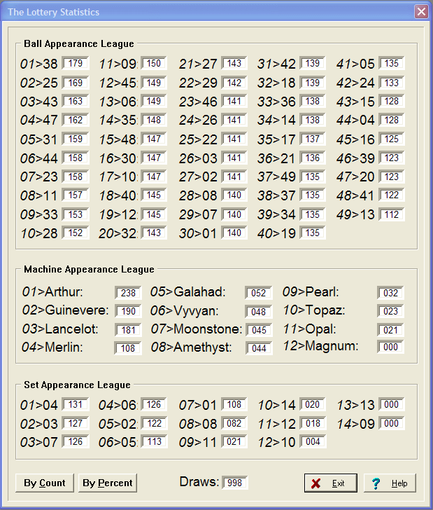 - It has the ability to display a number of Lottery statistics using the "Show Lottery Statistics" option. This will display a form showing a "Ball Appearance League", "Machine Appearance League" and a "Set Appearance League". There are also Buttons to allow you to display the results by Count, or Percentage.